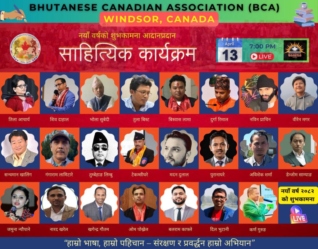 भूटानी क्यानाडियन एशोसिएसन (BCA) ले नेपाली नयाँ वर्ष २०८२ को अवसरमा एक भव्य साहित्यिक कार्यक्रमको आयोजना गर्ने भएको छ। अप्रिल १३ का दिन साँझ ७:०० बजे उज्यालो विन्डसर (Ujjaylo Windsor) मार्फत प्रत्यक्ष प्रसारण हुने यस कार्यक्रममा, संसारभरका साहित्यकार, कवि, लेखक तथा वक्ताहरूको सहभागिता रहनेछ अध्यक्ष कृश अधिकारीले बताउनु भएको छ।