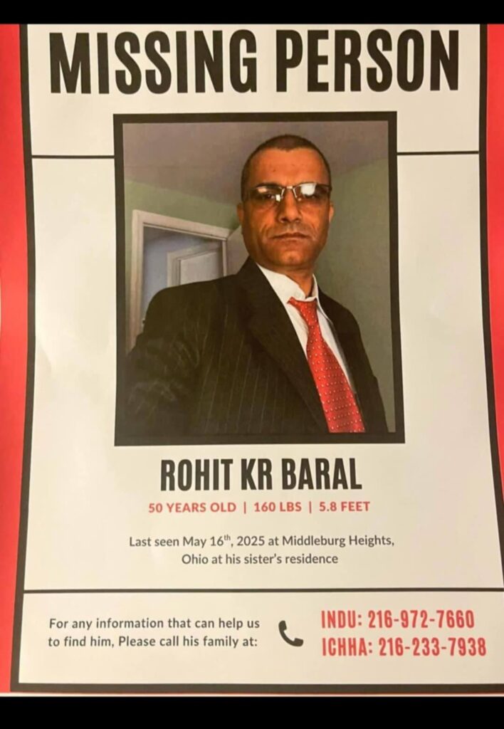 समुदायले सबैलाई रोहित बरालको खोजीमा सहयोग गर्न आग्रह गर्दै, यदि कसैसँग उनीसम्बन्धी कुनै जानकारी भएमा इच्छाअधिकारीलाई २१६–२३३–७९३८ वा इन्दु बराललाई २१६–९७२–७६६० मा तुरुन्त सम्पर्क गर्न अनुरोध गरेको छ।