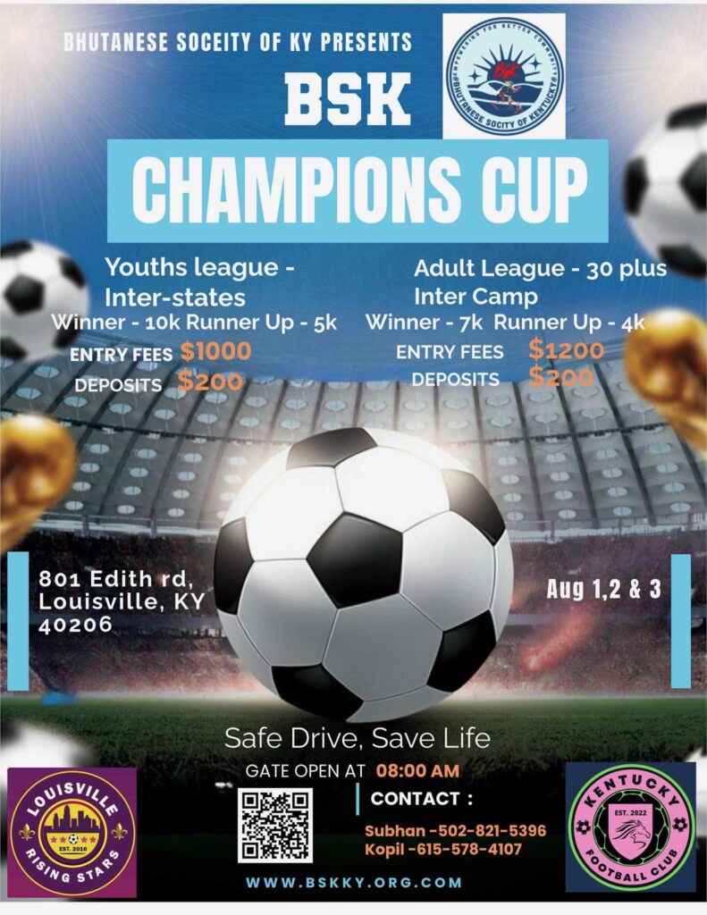 लुइभिल, केन्टकी — भुटानी समाज केन्टकी (बी.एस.के.) लुइभिलको फुटबल समुदायसँगको सहकार्यमा ऐतिहासिक फुटबल प्रतियोगिता २०२५ को आयोजना गर्ने घोषणा गरेको छ। अगस्ट १, २ र ३ तारिखमा हुने यो विशेष प्रतियोगिता लुइभिल शहर र सम्पूर्ण भुटानी समुदायका लागि अत्यन्त महत्वपूर्ण र ऐतिहासिक हुने विश्वास भुटानी समाज केन्टकी (BSK) का अध्यक्ष भीम कोइरालाले जानकारी दिनु भएको छ।