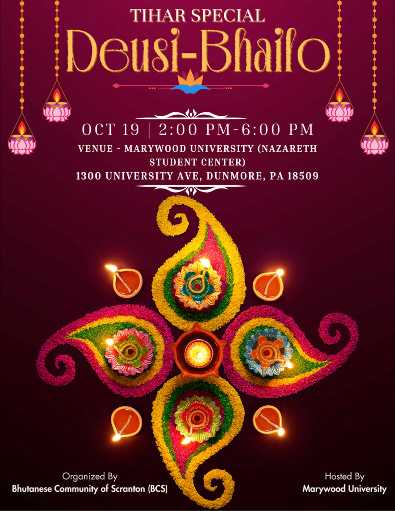 स्क्रेन्टनमा, पेनसिलभेनिया — भुटानी समुदाय स्क्रेन्टन (बीसीएस) ले यस वर्षको तिहार पर्वलाई विशेष र भव्य बनाउन देउसी–भैलो कार्यक्रम आयोजना गर्ने भएको छ। आगामी अक्टोबर १९, २०२५, आइतबार दिउँसो २:०० बजेदेखि साँझ ६:०० बजेसम्म यो कार्यक्रम मेरीउड विश्वविद्यालय (Marywood University) को नाजारेथ विद्यार्थी केन्द्र (Nazareth Student Center), 1300 University Ave, Dunmore, PA 18509 मा सम्पन्न हुनेछ।