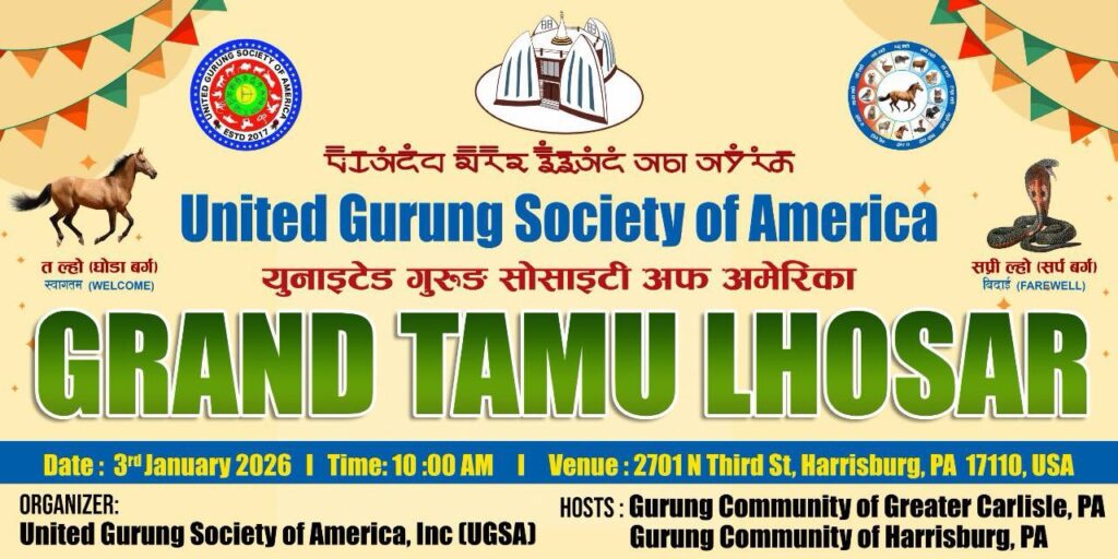 ह्यारिसबर्ग, पेनसिल्भेनिया — अमेरिका स्थित गुरुङ समुदायको छाता संगठन युनाइटेड गुरुङ सोसाइटी अफ अमेरिका (UGSA) ले २०२६ जनवरी ३ तारिखका दिन ग्रान्ड तमु ल्होसार भव्य रूपमा मनाउने भएको छ। नयाँ वर्षको शुभारम्भसँगै गुरुङ समुदायलाई एक ठाउँमा जोड्ने उद्देश्यले आयोजना गरिने यो कार्यक्रम ह्यारिसबर्ग स्थित 2701 N Third Street, Harrisburg, PA 17110 मा बिहान १०:०० बजे बाट सुरु हुने जनाइएको छ।
