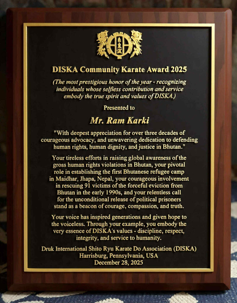 Human rights campaigner Ram Karki has been honoured with the 2025 DISKA Community Karate Award, the most prestigious annual award of the Druk International Shito Ryu Karate Do Association (DISKA), in recognition of more than three decades of courageous advocacy for Bhutanese refugees and political prisoners.