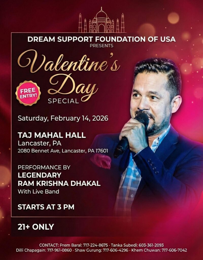 अमेरिकामा क्रियाशील सामाजिक संस्था ड्रिम सपोर्ट फाउन्डेसन अफ यूएसए ले शनिबार, फेब्रुअरी १४, २०२६ का दिन पेन्सिल्भेनियाको ल्यान्कास्टरस्थित ताज महल हल मा भव्य भ्यालेन्टाइन डे विशेष सांगीतिक तथा सांस्कृतिक कार्यक्रम आयोजना गर्ने घोषणा गरेको छ।